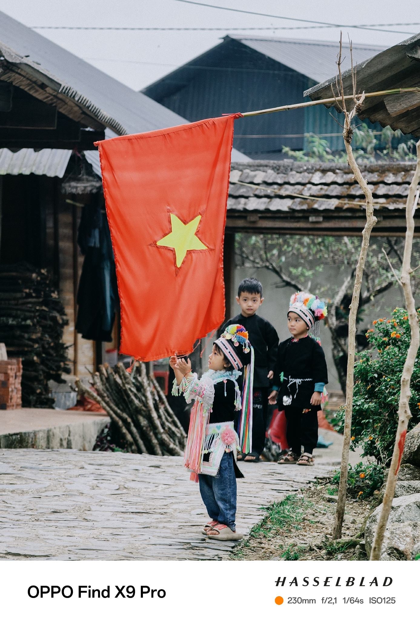 Chiều tối, tôi ra gần trường mầm non trong bản. Lũ trẻ tan học, ríu rít chạy về nhà. Ở đây, trẻ con vẫn là trẻ con thật sự — không bị kéo ra bán hàng hay làm việc. Chúng chỉ chơi, cười, đuổi nhau dưới lá cờ treo gần nhà. Mấy đứa nhỏ mặc áo truyền thống, hoa văn lạ và đẹp, khác hẳn những nhóm Dao khác mà tôi từng gặp.